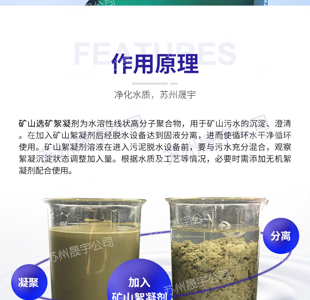 矿山选矿絮凝剂用于铁矿、铜矿、铅锌矿、金矿等矿山水处理,可促使悬浊粒子快速的凝集沉降达到分离澄清的效果,可提高处理效率,降低运行成本。根据水质及工艺等情况,选择适用的矿山选矿絮凝剂型号。